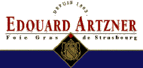 C'est à cette date que Philippe Artzner ouvre une boutique de Foie Gras à Strasbourg. Son fils Edouard eut l'idée de mettre les premiers Foies Gras en terrine en 1850. Déjà fournisseur favori des cours royales au siècle dernier, Edouard Artzner s'est depuis forgé une réputation internationale de qualité, pour devenir l'un des fleurons de notre gastronomie. Si Edouard Artzner est aujourd'hui la plus ancienne maison de Foie Gras toujours en activité, c'est parce que la recette de ses authentiques Foies Gras de Strasbourg est perpétuée par des chefs cuisiniers depuis des générations. |